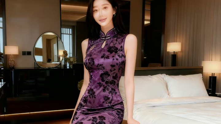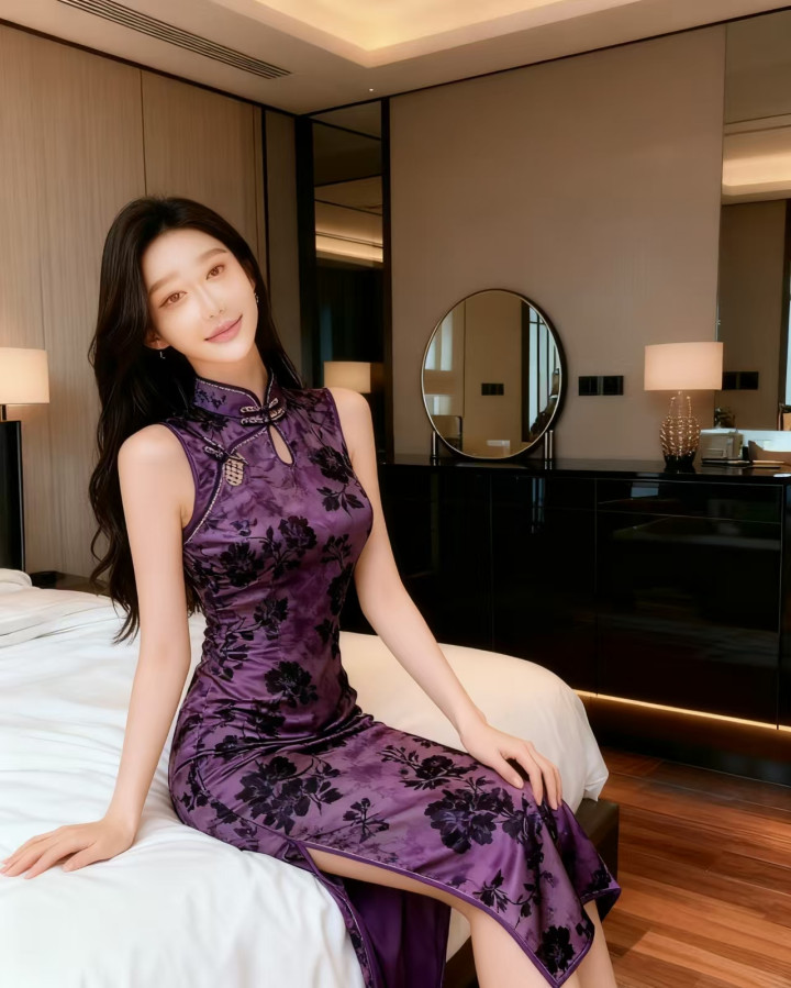 深紫色古风旗袍, 优雅老练气质, 修身显身材。