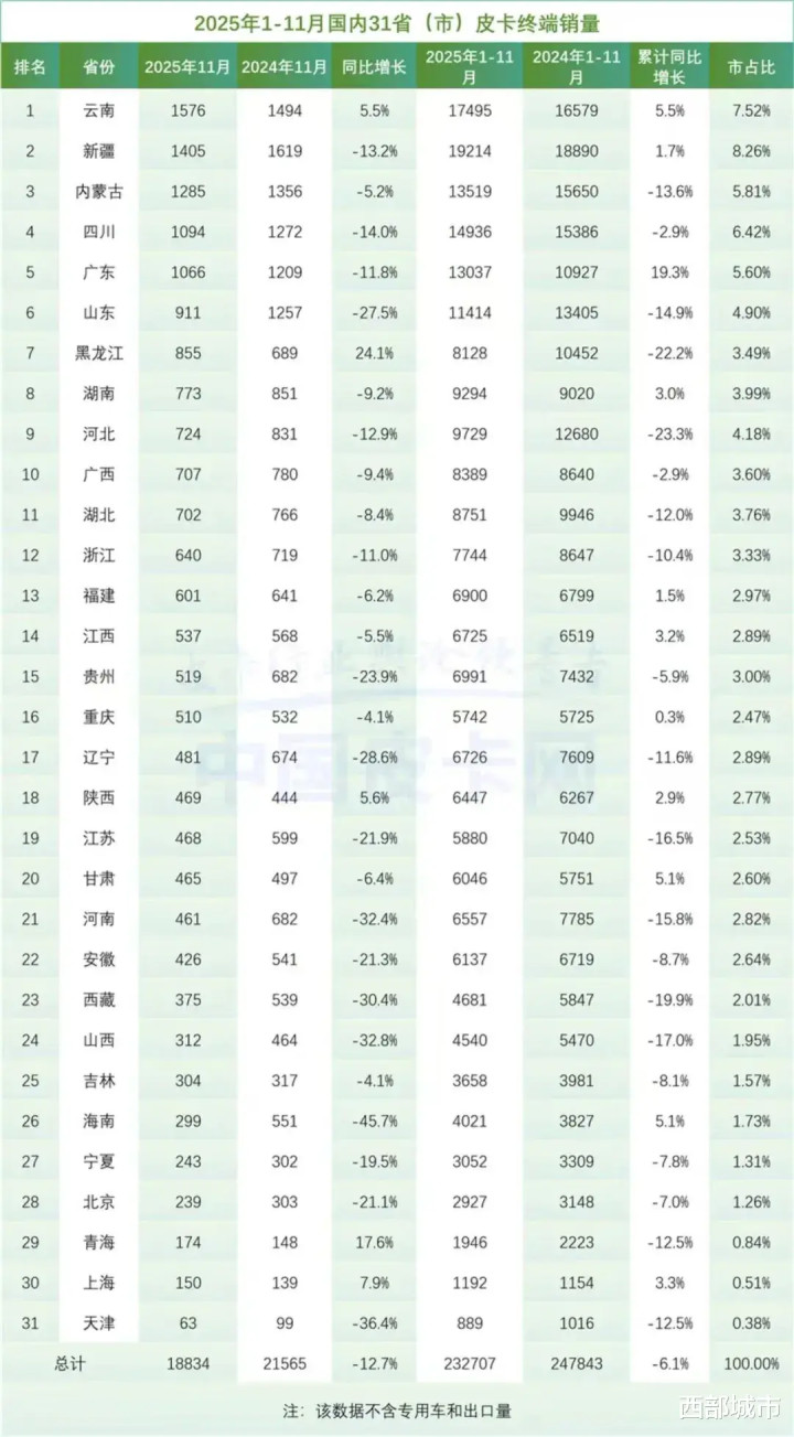 后果不错说是立竿见影:昔日云南省皮卡销量增幅为27.3%,辽宁省增幅为15.4%,河南省增幅为14.8%。