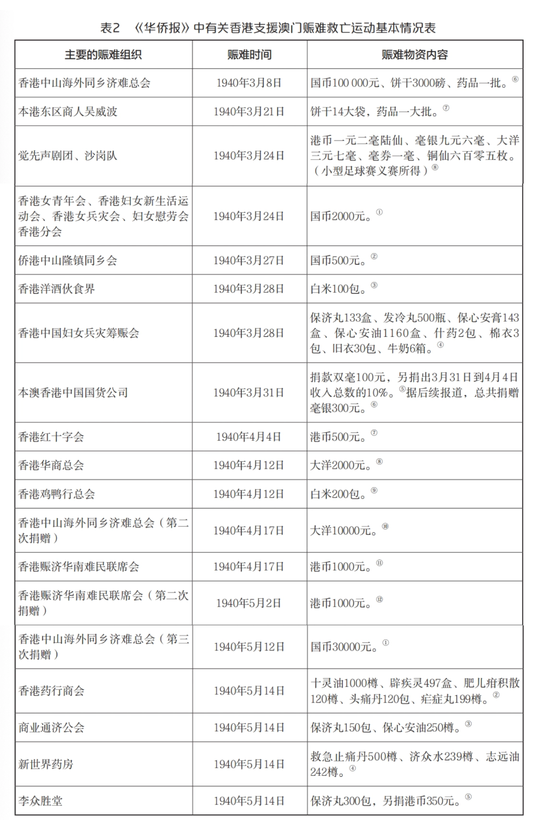 港澳两地隔海相望,交通方便,日军攻陷中山以后,有很多中山县百姓障碍澳门,乘船逃往香港。《华裔报》在1940年3月11日发布公告指示往港中山百姓乘船需佩戴20元港币,否则无法过境,从侧面反馈出逃港百姓数目不少。香港爱国本家不忍看到中山百姓淹留澳门贫寒重重,涸泽而渔,纷繁向澳门汇寄善款,援助遇害者。该时间,《华裔报》对于香港驰援澳门的报说念出现14次,具体见表2:
