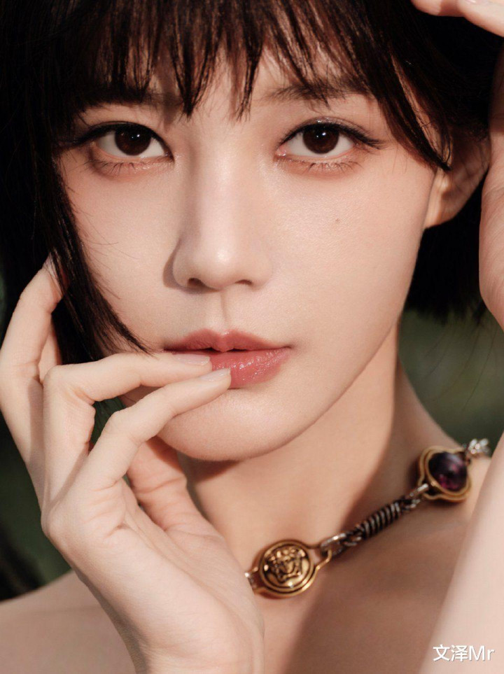 配景切换为邑邑苍苍的树林,绿意盎然。她倚靠在一块布满纹理的树桩上,左手撑桩,右手轻扶面颊,目光自信柔媚。玄色褶皱长裙与当然配景酿成显著对比,却又奇妙地相亲相爱。致密的五官分袂恰到平正,尤其是一对亮堂有神的大眼睛,成为她最具辨识度的特征之一。