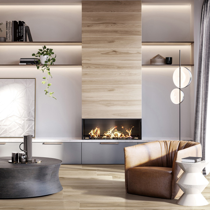 像图里这么,把组海外瓷砖品牌伊莉莎白蓝山橡木瓷砖用在壁炉 / 配景墙的纵向区域:浅暖原木纹理自带柔软滤镜,纵向通铺能拉伸空间比例,搭配无主灯的线性光,既弱化了墙面的 “空闲感”,又让当然肌理成为视觉焦点 —— 哪怕客厅面积不大,也能装出通透的 “大宅感”。
